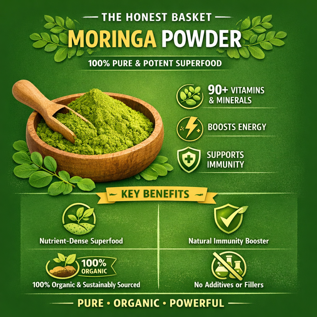 The Honest Basket Moringa powder is 100% pure and potent powder. Harvested from the finest Moringa Oliefera leaves. It is packed with 90+ vitamins, antioxidants, and minerals. Our easy-to-blend powder helps to boost energy, support immunity, and enhance overall wellness.