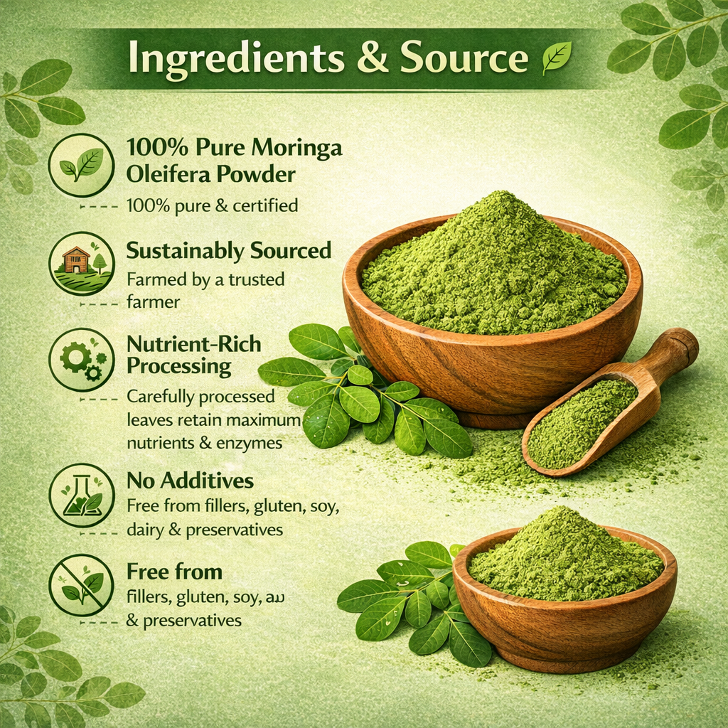 - Primary Ingredient: 100% pure & certified moringa oleifera powder.